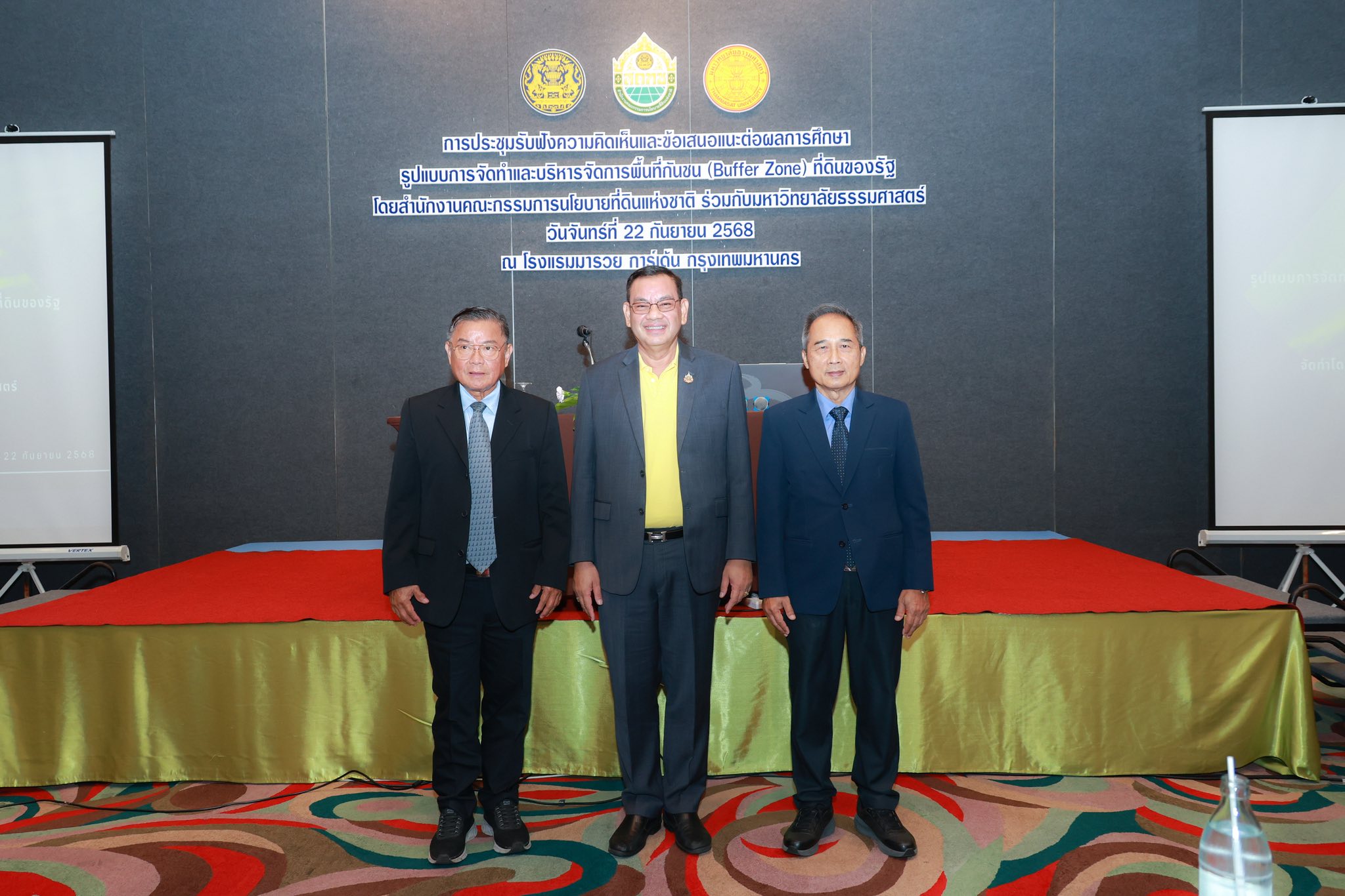วันนี้ (22 กันยายน 2568) เวลา 09.30 น. ณ ห้อง Ballroom C ชั้น 2 โรงแรมมารวยการ์เด้น กรุงเทพมหานคร ดร.รวีวรรณ ภูริเดช ผู้อำนวยการสำนักงานคณะกรรมการนโยบายที่ดินแห่งชาติ (ผอ.สคทช.) มอบหมายให้ นายสุริยน พัชรครุกานนท์ (รอง ผอ.สคทช.) เป็นประธานเปิดการประชุมรับฟังความคิดเห็นและข้อเสนอแนะต่อผลการศึกษารูปแบบการจัดทำและบริหารจัดการพื้นที่กันชน (Buffer Zone) ที่ดินของรัฐ ภายใต้โครงการศึกษารูปแบบการจัดทำและบริหารจัดการพื้นที่กันชน (Buffer Zone) ที่ดินของรัฐ เพื่อให้สอดคล้องกับผลการปรับปรุงแผนที่แนวเขตที่ดินของรัฐแบบบูรณาการ มาตราส่วน 1 : 4000 (One Map) โดยมีมหาวิทยาลัยธรรมศาสตร์ เป็นที่ปรึกษาโครงการฯ ได้มีการนำเสนอผลการศึกษารูปแบบการจัดทำและบริหารจัดการพื้นที่กันชน (Buffer Zone) ที่ดินของรัฐ