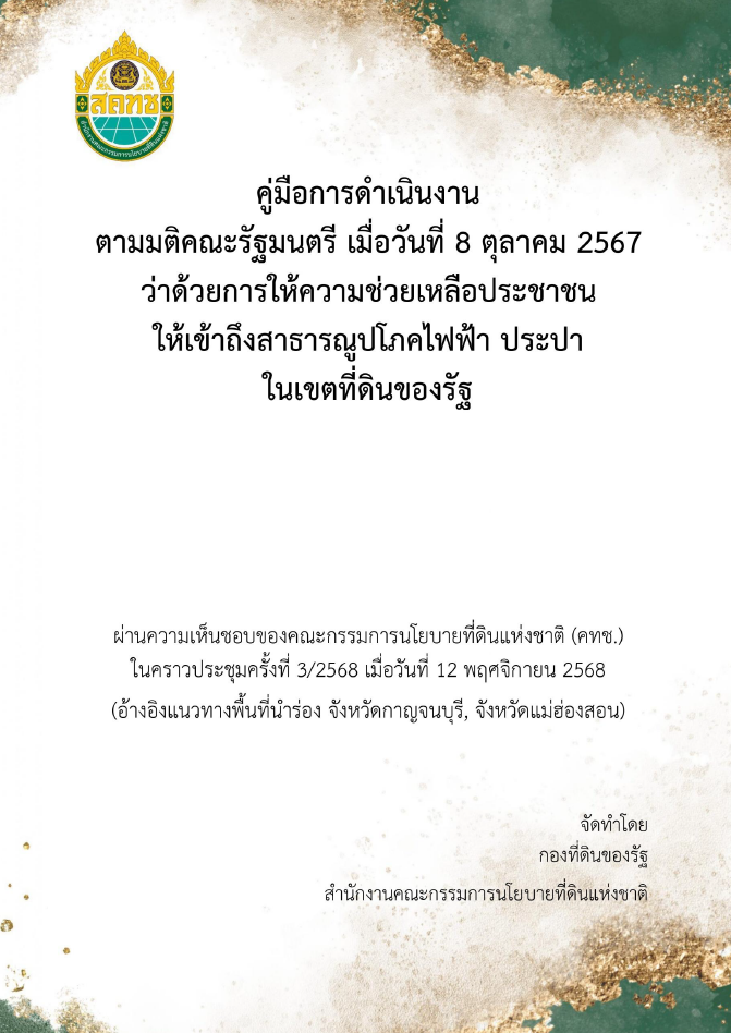 คู่มือการดำเนินงานตามมติคณะรัฐมนตรี เมื่อวันที่ 8 ตุลาคม 2567 ว่าด้วยการให้ความช่วยเหลือประชาชนให้เข้าถึงสาธารณูปโภคไฟฟ้า ประปา ในเขตที่ดินของรัฐ