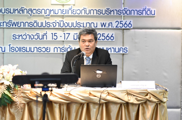 เมื่อวันพุธที่ 15 มีนาคม 2566 เวลา 08.30 น. ณ ห้องประชุมรวยสุข 2 โรงแรมมารวย การ์เด้น กรุงเทพมหานคร นายสุริยน พัชรครุกานนท์ รอง ผอ.สคทช. เป็นประธานเปิดการอบรมหลักสูตรกฎหมายเกี่ยวกับการบริหารจัดการที่ดินและทรัพยากรดิน โดยมี นางสาวสุวลักษณ์ จูสวัสดิ์ ผู้อำนวยการกองกฎหมาย กล่าวรายงานถึงวัตถุประสงค์ในการฝึกอบรม เพื่อเสริมสร้างและพัฒนาศักยภาพของเจ้าหน้าที่ผู้ปฏิบัติงานให้มีความรู้ ความเข้าใจเกี่ยวกับกฎหมายที่ดินแต่ละประเภทที่ใช้ในการบริหารจัดการที่ดิน และสามารถนำความรู้ที่ได้รับไปปรับใช้ในการทำงานได้อย่างมีประสิทธิภาพ