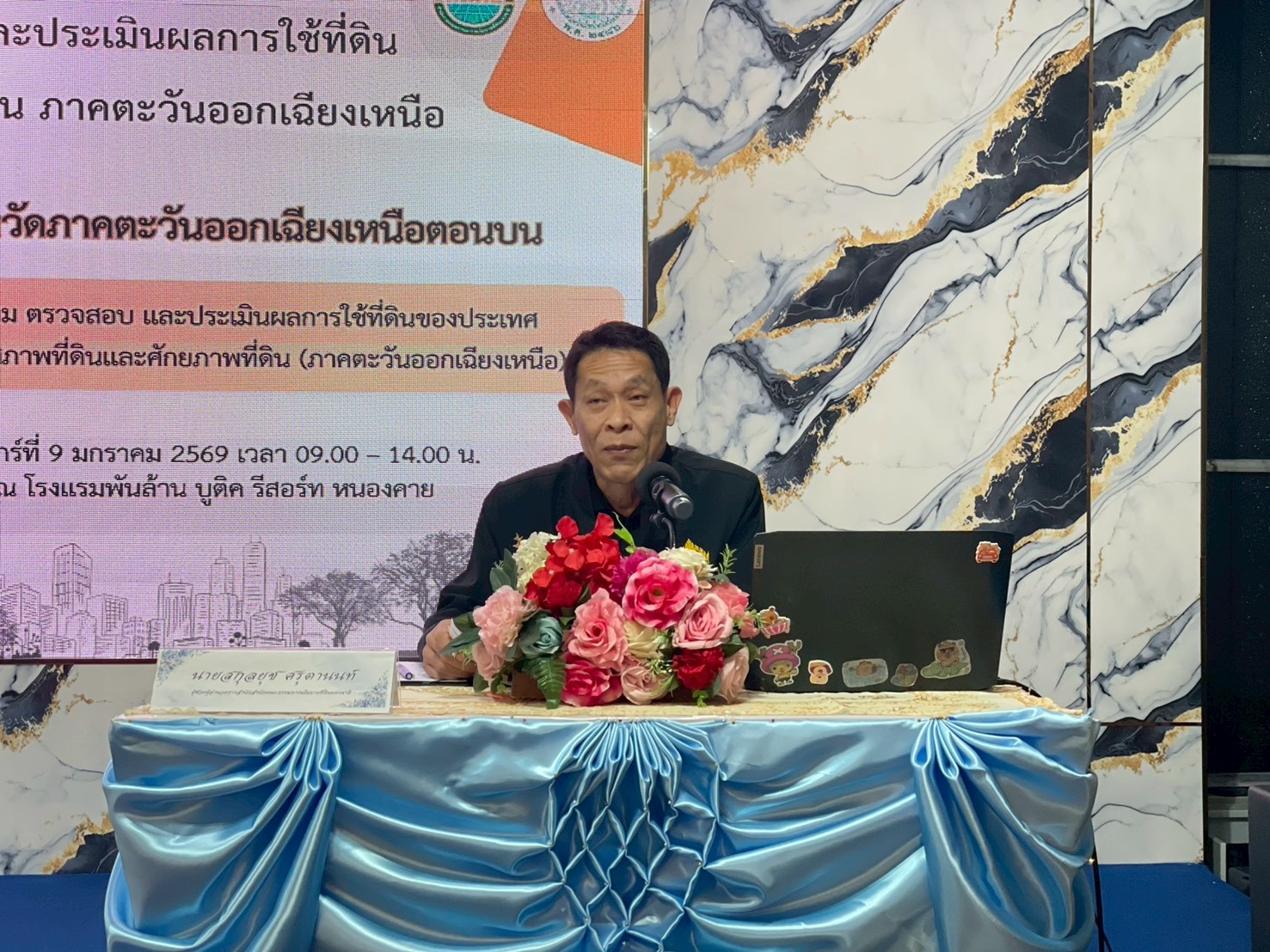 วันนี้ (9 มกราคม 2569) นายสกุลยุช ศรุตานนท์ ผู้ช่วยผู้อำนวยการสำนักงานคณะกรรมการนโยบายที่ดินแห่งชาติ เป็นประธานการประชุมนำเสนอรายงานติดตาม ตรวจสอบ และประเมินผลการใช้ที่ดินของประเทศให้เหมาะสมกับสภาพที่ดินและศักยภาพที่ดิน ภาคตะวันออกเฉียงเหนือ ซึ่งเป็นกิจกรรมหนึ่งภายใต้โครงการติดตาม ตรวจสอบ และประเมินผลการใช้ที่ดินของประเทศให้เหมาะสมกับสภาพที่ดินและศักยภาพที่ดิน (ภาคตะวันออกเฉียงเหนือ) ประจำปีงบประมาณ พ.ศ. 2568 โดยมี ดร.กลย์วัฒน์ สาขากร ผอ.กสร. เป็นผู้กล่าวรายงาน ที่ปรึกษาโครงการฯ คณะวนศาสตร์ มหาวิทยาลัยเกษตรศาสตร์ เป็นผู้ดำเนินรายการ และมีผู้เข้าร่วมประชุมจากหน่วยงานที่เกี่ยวข้อง รวมถึงสถาบันการศึกษาในพื้นที่จังหวัดหนองคาย รวมทั้งสิ้น 105 คน ณ ห้องประชุมกาสะลอง ชั้น 1 โรงแรมพันล้าน บูติค รีสอร์ท จังหวัดหนองคาย และจังหวัดข้างเคียงในบริเวณภาคตะวันออกเฉียงเหนือตอนบน ได้แก่ จังหวัดเลย จังหวัดบึงกาฬ จังหวัดหนองบัวลำภู และจังหวัดอุดรธานี เข้าร่วมรับฟังและให้ความเห็นผ่านระบบสื่ออิเล็กทรอนิกส์ Video Conference (Webex Meetings) จำนวน 48 หน่วยงาน