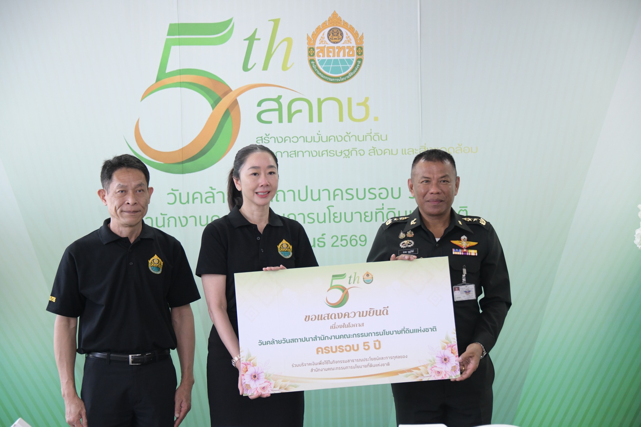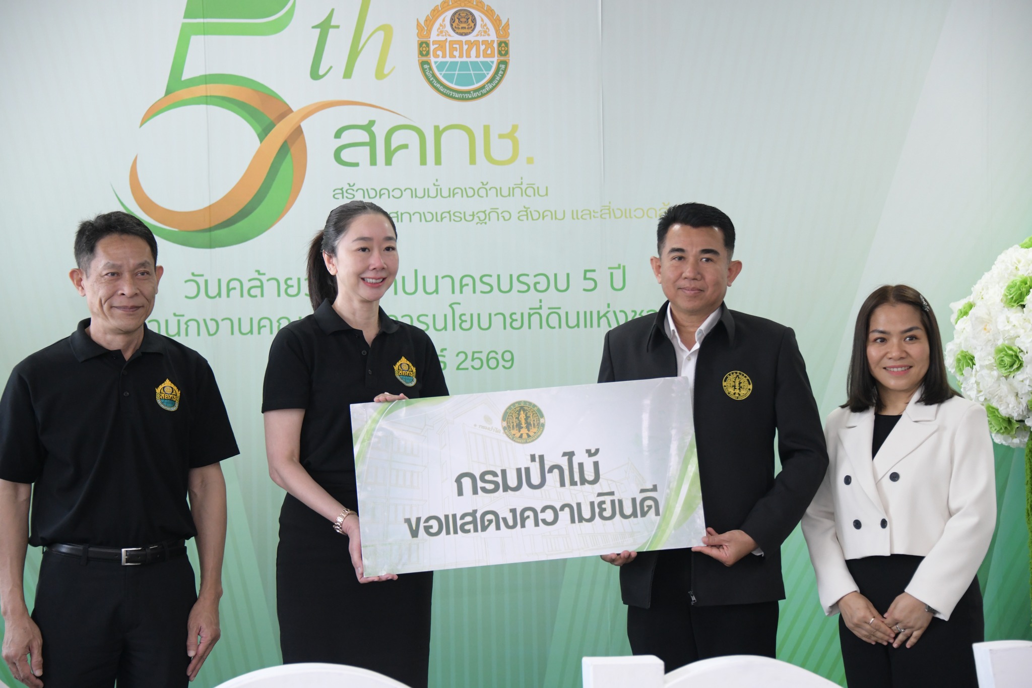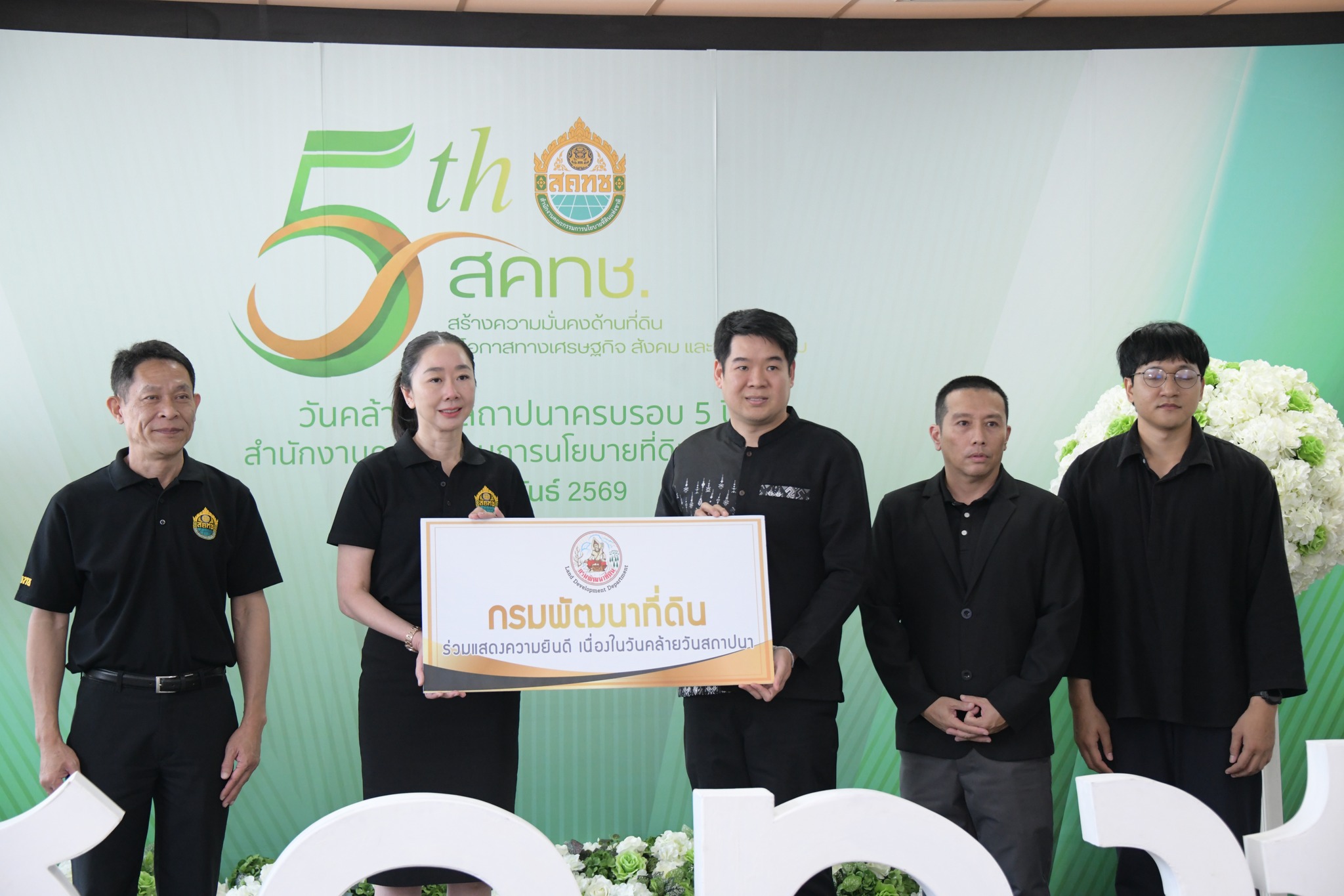วันนี้ (11 กุมภาพันธ์ 2569) เวลา 10.00 น. ณ บริเวณโถง ชั้น 20 สำนักงานคณะกรรมการนโยบายที่ดินแห่งชาติ ดร.ชญานันท์ ภักดีจิตติ์ ผู้อำนวยการสำนักงานคณะกรรมการนโยบายที่ดิน แห่งชาติ (ผอ.สคทช.) พร้อมด้วย นายสกุลยุช ศรุตานนท์ ผู้ช่วย ผอ.สคทช. และผู้บริหาร สคทช. ให้การต้อนรับ ผู้บริหารระดับสูงและผู้แทนจากหน่วยงานภาครัฐ รัฐวิสาหกิจ องค์การมหาชน และภาคเอกชน จำนวนกว่า 50 หน่วยงาน ในโอกาสเข้าร่วมแสดงความยินดีและร่วมแสดงพลังความร่วมมือ เนื่องในโอกาสวันคล้ายวันสถาปนาครบรอบ 5 ปี สำนักงานคณะกรรมการนโยบายที่ดินแห่งชาติ อาทิ กรมทรัพยากรน้ำ กรมที่ดิน การยางแห่งประเทศไทย กรมทรัพยากรทางทะเลและชายฝั่ง สำนักงานคณะกรรมการคุ้มครองข้อมูลส่วนบุคคล กรมพัฒนาสังคมและสวัสดิการ กรมส่งเสริมการปกครองท้องถิ่น สำนักงานปลัดกระทรวงดิจิทัลเพื่อเศรษฐกิจและสังคม การประปาส่วนภูมิภาค กรมพัฒนาที่ดิน กรมทางหลวง สำนักงานพัฒนาวิทยาศาสตร์และเทคโนโลยีแห่งชาติ สำนักงานปลัดสำนักนายกรัฐมนตรี องค์การอุตสาหกรรมป่าไม้ กรมธนารักษ์ สำนักงานคณะกรรมการป้องกันและปราบปรามการทุจริตในภาครัฐ กรมแผนที่ทหาร การประปานครหลวง บริษัท ปตท.สำรวจและผลิตปิโตรเลียม จำกัด (มหาชน) สถาบันบริหารจัดการธนาคารที่ดิน การไฟฟ้าฝ่ายผลิตแห่งประเทศไทย ธนาคารกรุงไทย จำกัด (มหาชน) กรมโยธาธิการและผังเมือง กรมวิชาการเกษตร ศูนย์อำนวยการรักษาผลประโยชน์ของชาติทางทะเล องค์การสวนสัตว์แห่งประเทศไทย ในพระบรมราชูปถัมภ์ สำนักงานนโยบายและแผนทรัพยากรธรรมชาติและสิ่งแวดล้อม กรมชลประทาน กรมการเปลี่ยนแปลงสภาพภูมิอากาศและสิ่งแวดล้อม การเคหะแห่งชาติ สำนักงานเศรษฐกิจการเกษตร บริษัทเอสซีจี แพคเกจจิ้ง จำกัด (มหาชน) สำนักงานปลัดกระทรวงมหาดไทย องค์การบริหารจัดการก๊าซเรือนกระจก (องค์การมหาชน) สำนักงานการปฏิรูปที่ดินเพื่อเกษตรกรรม สำนักงานปลัดกระทรวงสาธารณสุข สำนักงานส่งเสริมวิสาหกิจขนาดกลางและขนาดย่อม กรมป่าไม้ บริษัท ปตท. จำกัด (มหาชน) กรมควบคุมมลพิษ สำนักงานคณะกรรมการป้องกันและปราบปรามการทุจริตแห่งชาติ กระทรวงยุติธรรม กรมทรัพยากรน้ำบาดาล กรมทรัพยากรธรณี กรมสรรพากร กรมการข้าว กรมอุทยานแห่งชาติ สัตว์ป่า และพันธุ์พืช ตลอดจนหน่วยงานที่เกี่ยวข้องอื่น ๆ