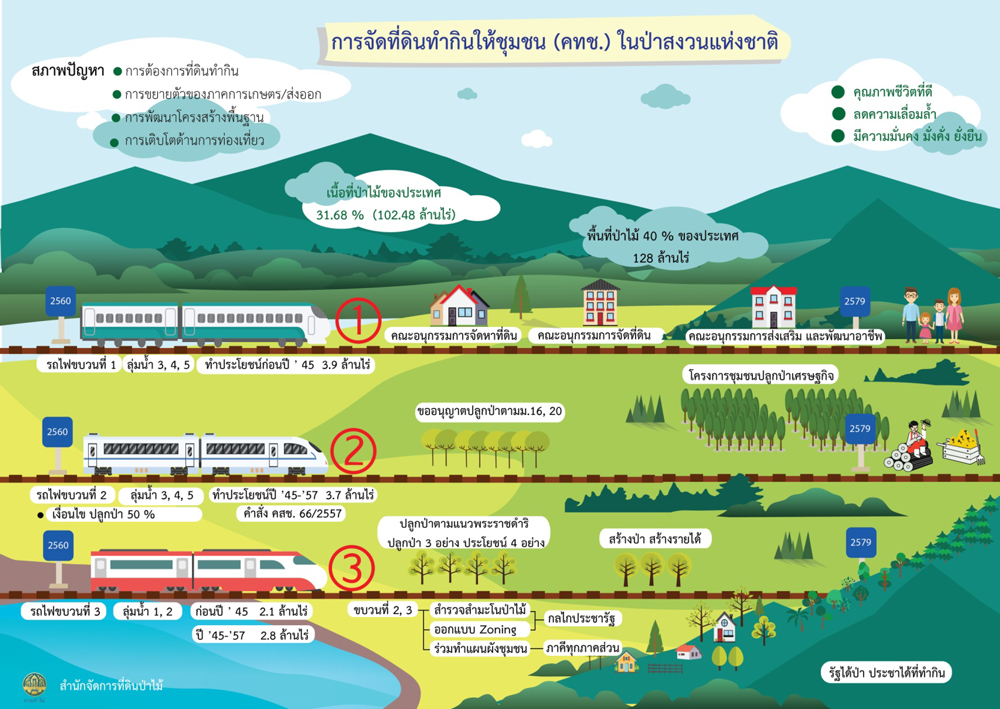 อย่างไรก็ตาม พื้นที่ป่าสงวนแห่งชาติที่ผ่านการสำรวจจากกรมป่าไม้โดยได้ดำเนินการอ่านแปลจากภาพถ่ายทางอากาศสี (Ortho Photo) เมื่อปี 2545 ยังคงมีราษฎรอยู่อาศัยทำกินในพื้นที่ลุ่มน้ำ ชั้นที่ 1, 2 จำนวน 2.1 ล้านไร่ และนอกจากนี้ยังปรากฏว่ามีการบุกรุกป่าสงวนแห่งชาติ ระหว่างปี 2545 – 2557 อยู่อีกส่วนหนึ่ง เป็นพื้นที่ลุ่มน้ำชั้นที่ 3, 4, 5 จำนวน 3.7 ล้านไร่ และพื้นที่ลุ่มน้ำชั้นที่ 1, 2 จำนวน 2.8 ล้านไร่ กระทรวงทรัพยากรธรรมชาติและสิ่งแวดล้อมจึงได้เสนอกรอบมาตรการแก้ไขปัญหาการอยู่อาศัยและทำกินในพื้นที่ป่าไม้ (ทุกประเภท) หรือที่เรารู้จักในชื่อ“รถไฟ 5 ขบวน” เพื่อไม่ให้มีการบุกรุกพื้นที่ป่าเพิ่มเติม โดยมีมติคณะรัฐมนตรี เมื่อวันที่ 26 พฤศจิกายน 2561 เห็นชอบกรอบมาตรการดังกล่าว แต่ในบทความนี้เราจะกล่าวถึงเฉพาะพื้นที่ป่าสงวนแห่งชาติเท่านั้น ซึ่งก็คือรถไฟขบวนที่ 1 ถึงขบวนที่ 3